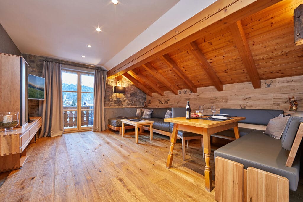 ,Außergewöhnliches Ambiente empfängt Sie in unserer neu renovierten 5-Sterne-Ferienwohnung Arnspitze. Der modernen Alpenstil hebt Ihren Urlaub auf ein ganz anderes Niveau. Mit Echtholzfußböden im Wohn- und Schlafzimmer sowie einem Boxpringbett ist die Wohnung auf höchstem Komfort eingerichtet.